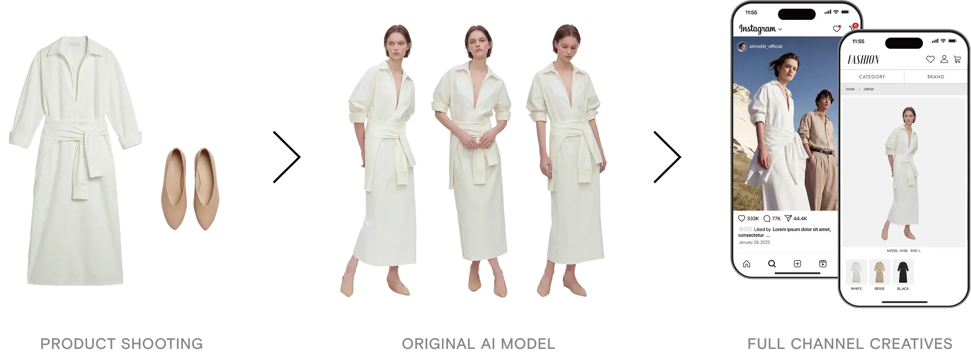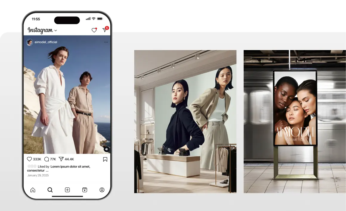 広告KV, プロモーション動画、特集ページ、店頭POP、カタログなどあらゆる顧客接点にAIモデルを登場させることができます。素材の提供だけでなく、一気通貫でサービスを提供します。